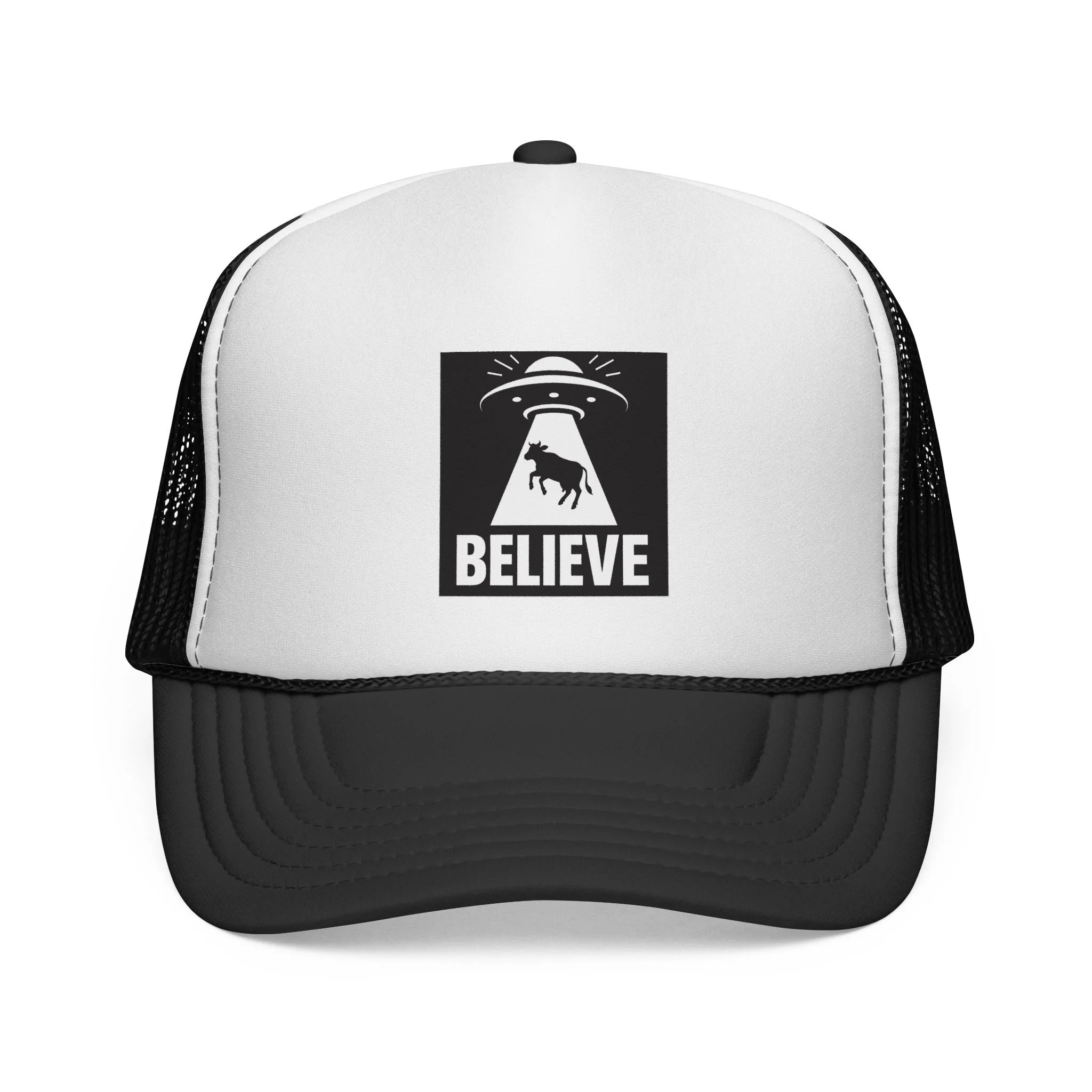A playful, vintage-style trucker cap that channels curiosity and roadside humor. The bold front panel print shows a retro UFO beaming up a cow with the word “BELIEVE” beneath — a wink to roadside attractions, conspiracy jokes, and late-night stargazing sessions. Lightweight mesh at the back keeps things airy on warm days. The adjustable snap closure and structured foam front give it that classic trucker silhouette that slips easily into everyday wear. Wear it on country drives, music festivals, or while chasing the next oddball roadside sighting — it sits right with people who love campfire stories, kitschy Americana, and a little cosmic mystery.